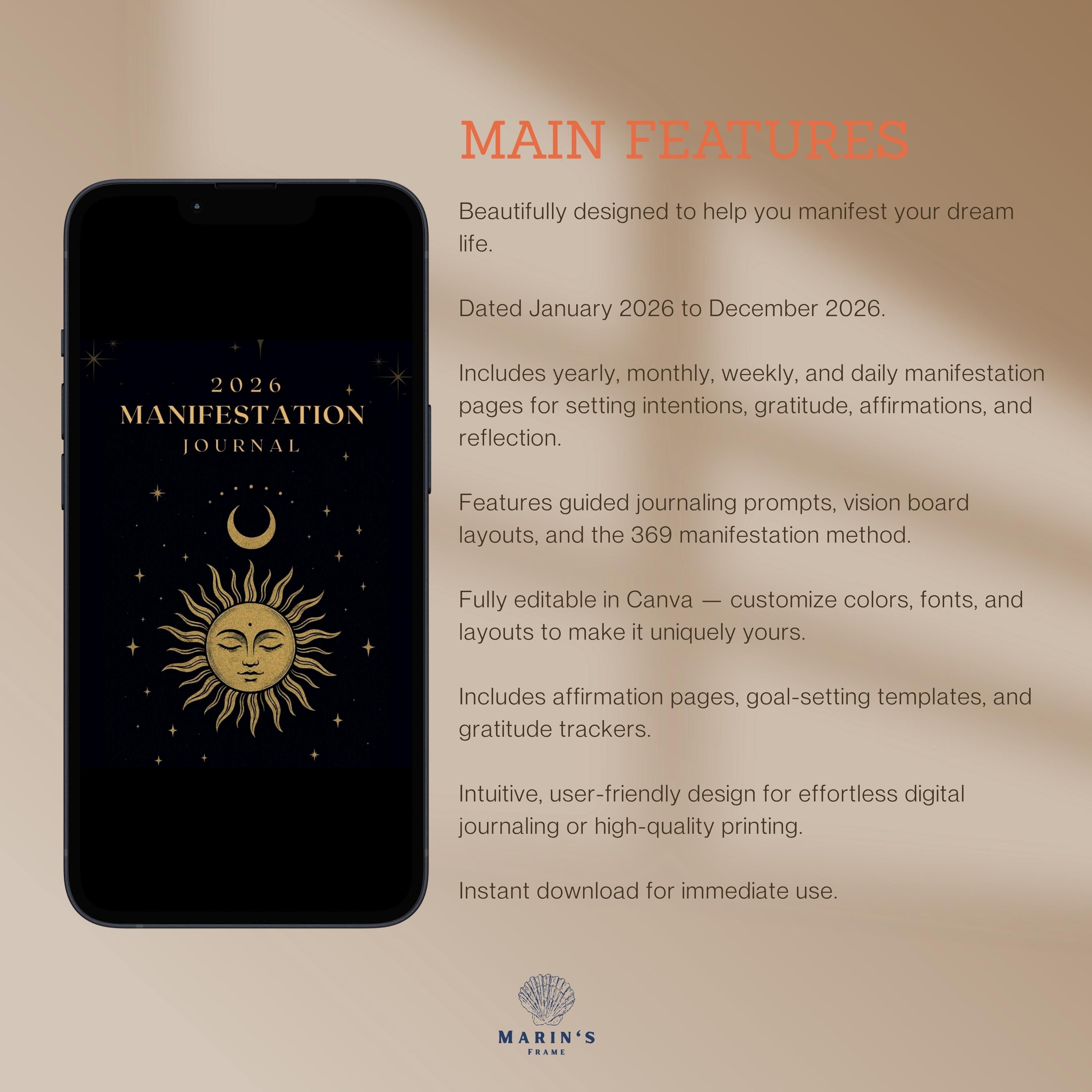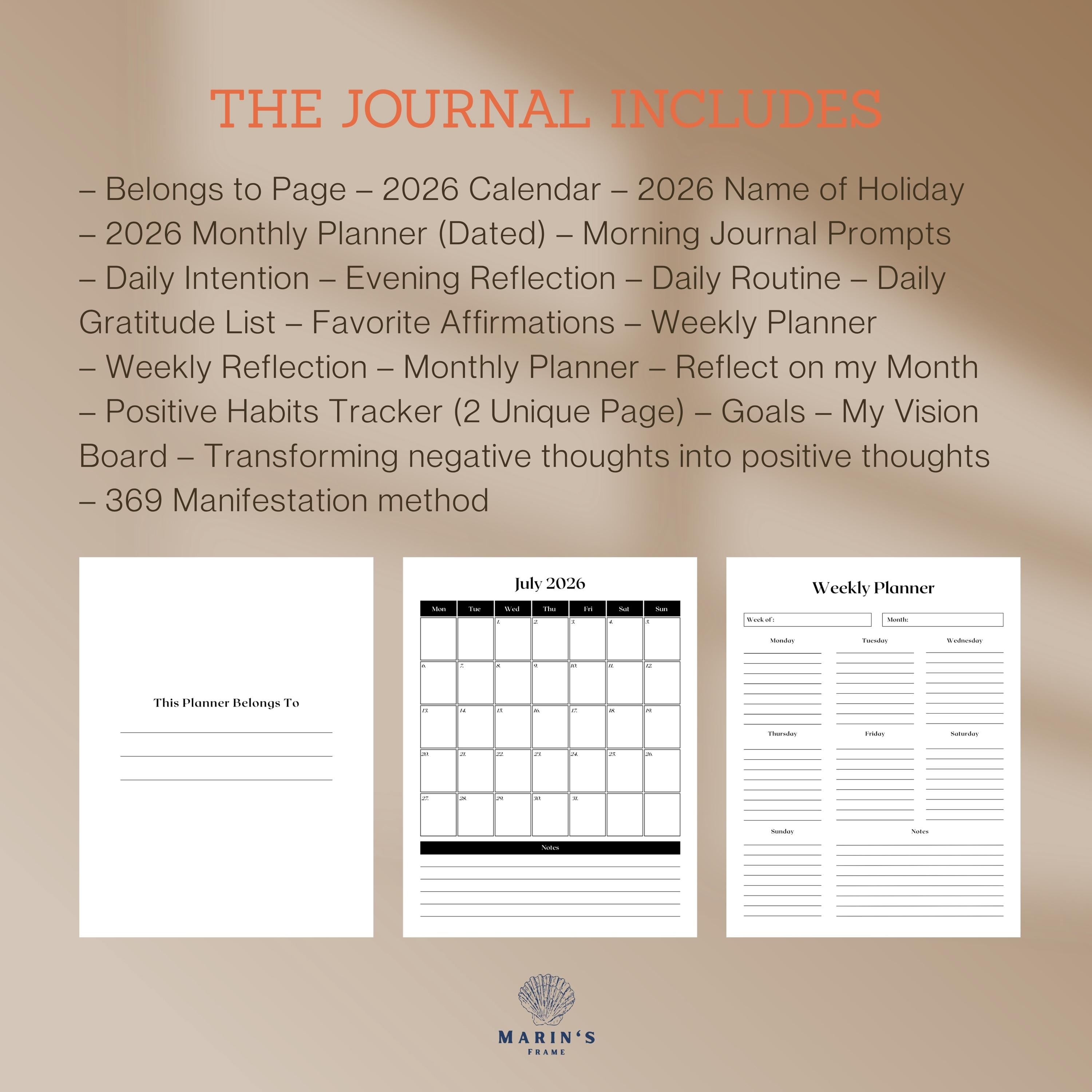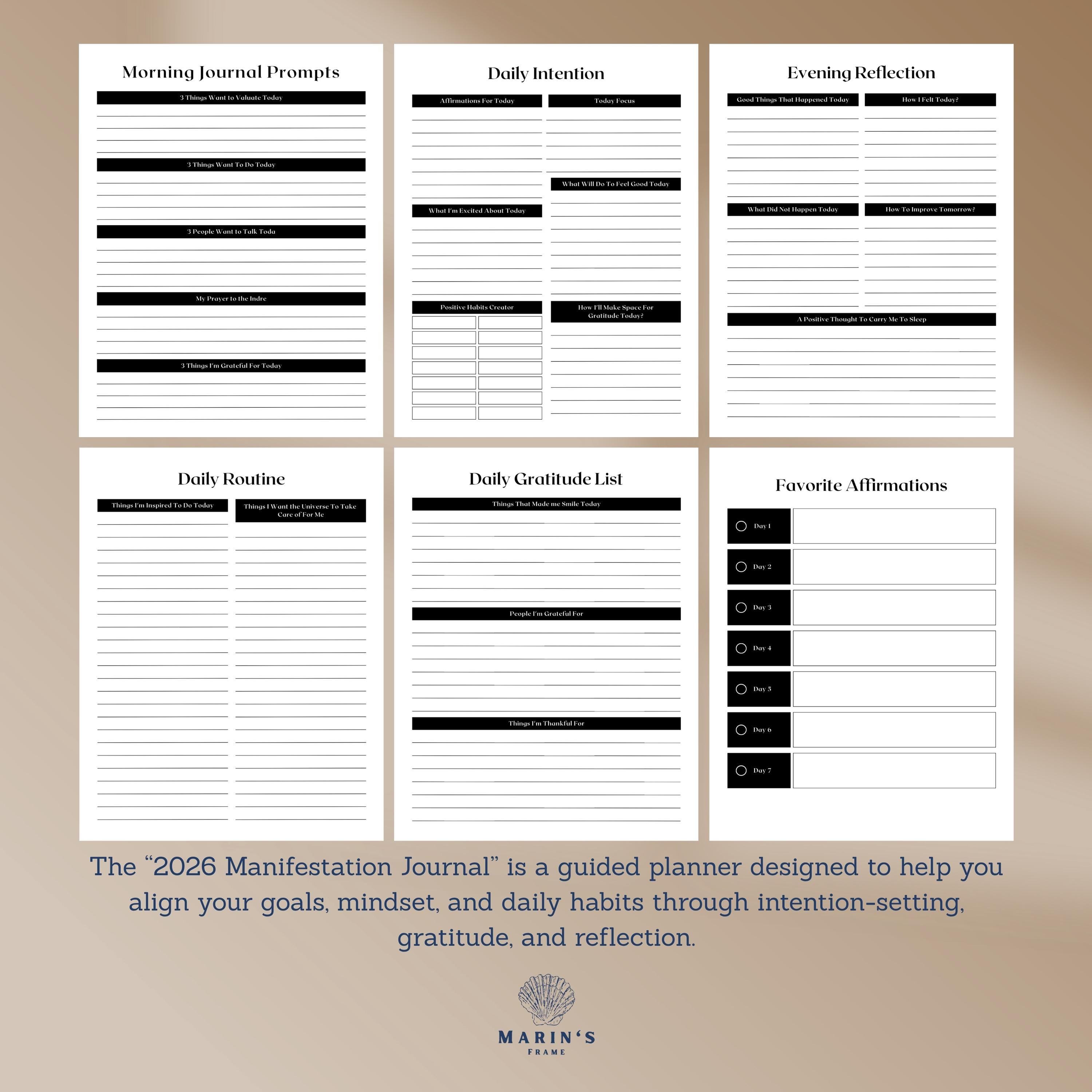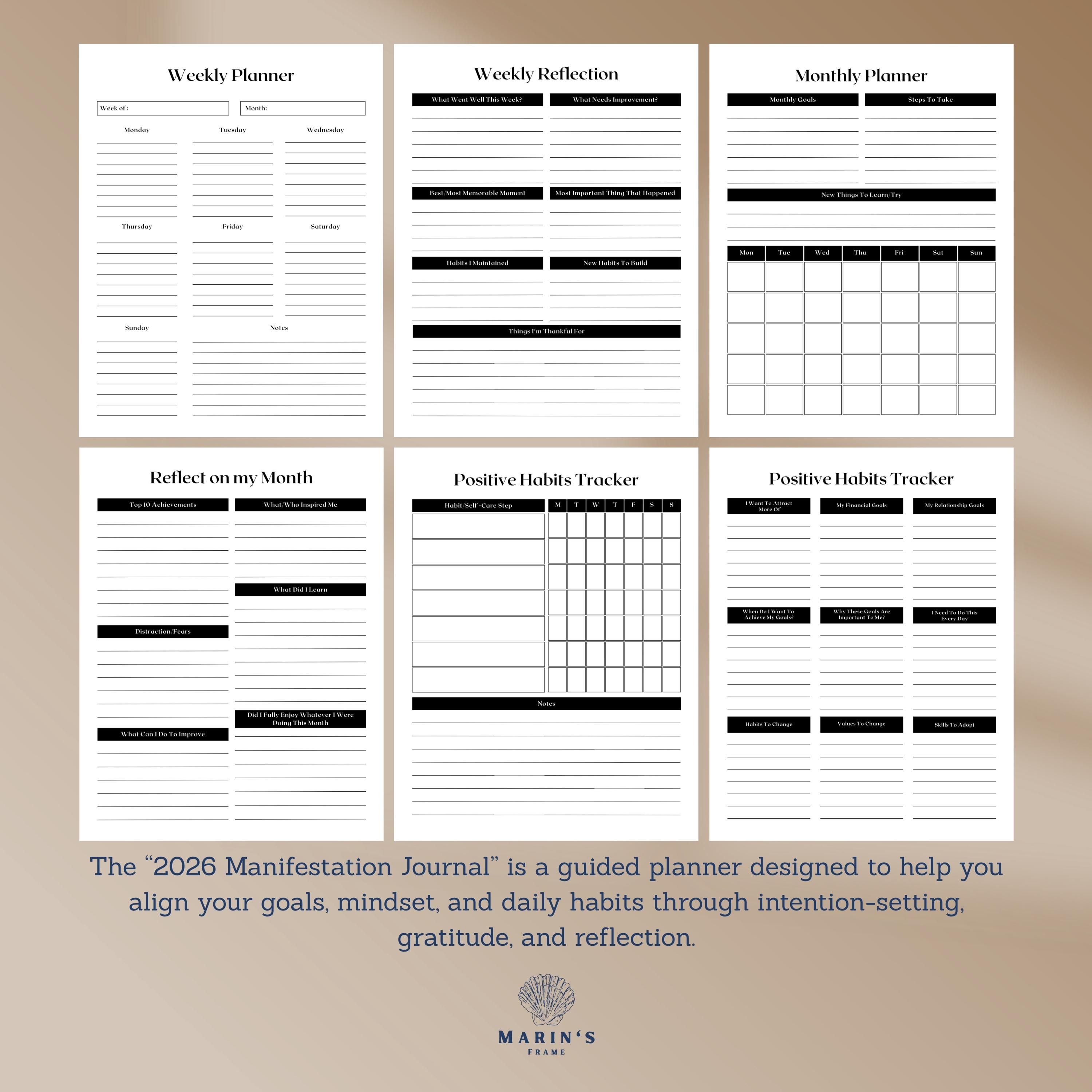 Use this Manifestation Journal to start manifesting the life you’ve always wanted! This guided planner helps you align your goals, mindset, and daily habits through intention-setting, gratitude, and reflection. Discover practical Law of Attraction tools that turn dreams into action — one page at a time. Perfect for anyone seeking to attract abundance, success, happiness, and purpose in 2026 and beyond.