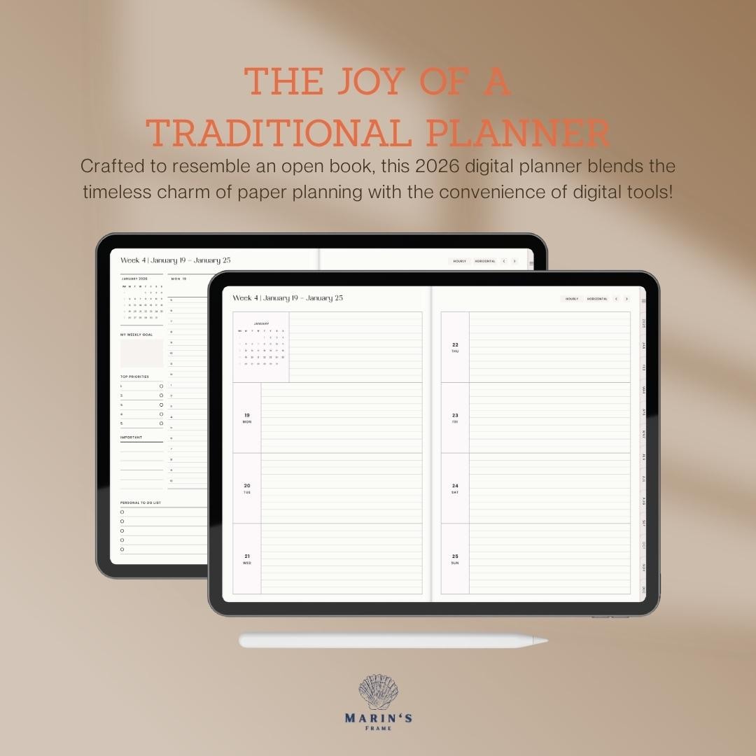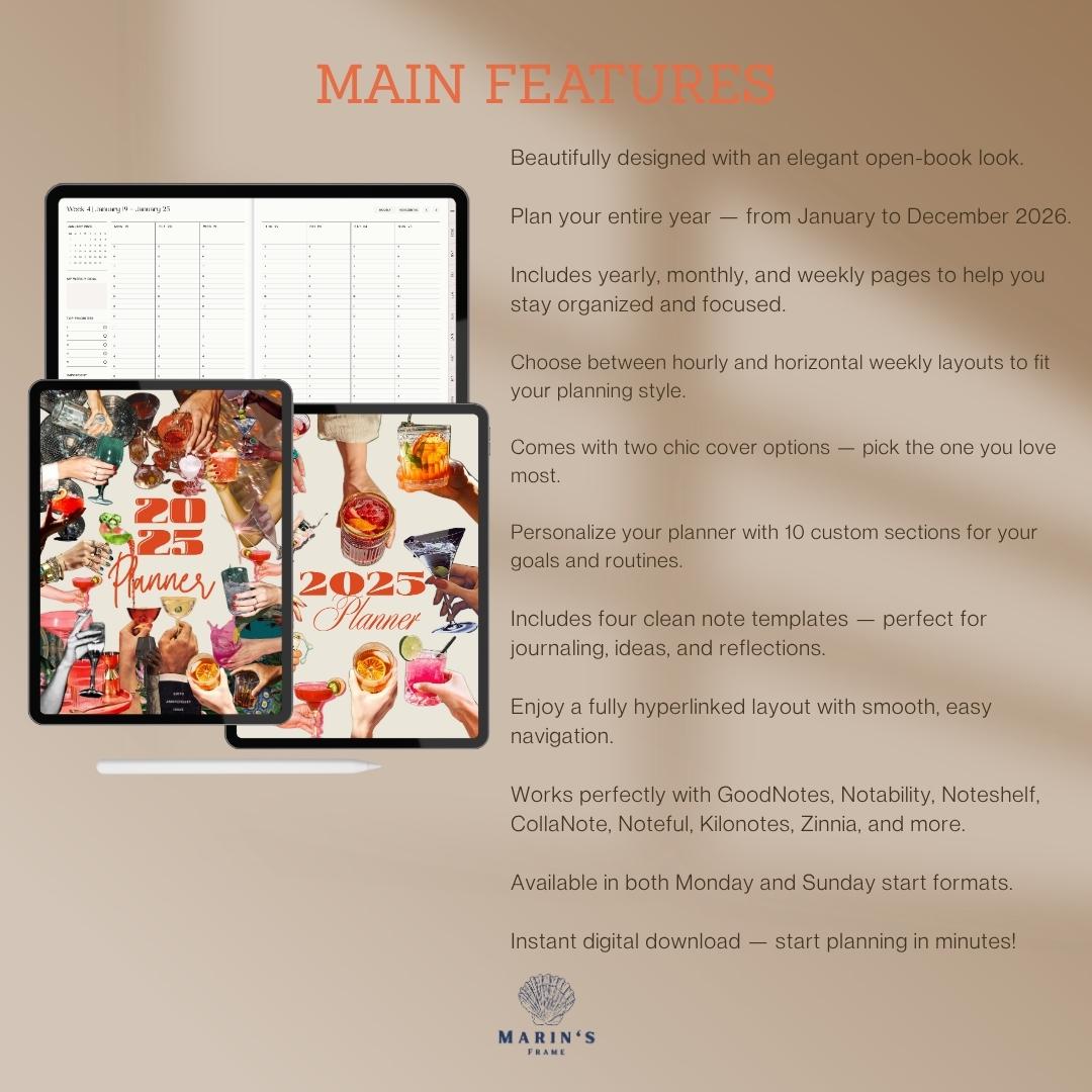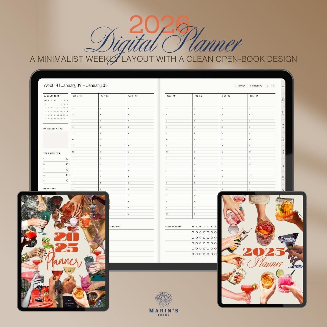 Unlock your productivity and elevate your planning experience with this beautifully designed 2026 digital planner, crafted to resemble the timeless elegance of an open book. Thoughtfully structured with yearly, monthly, and weekly pages, it helps you stay organized and on track! Navigate seamlessly with intuitive hyperlinks, and personalize your planner with 10 custom sections and versatile note templates. These pages are ideal for goal-setting, journaling, and project management. With two stylish cover options to choose from, this planner adapts to your unique lifestyle!