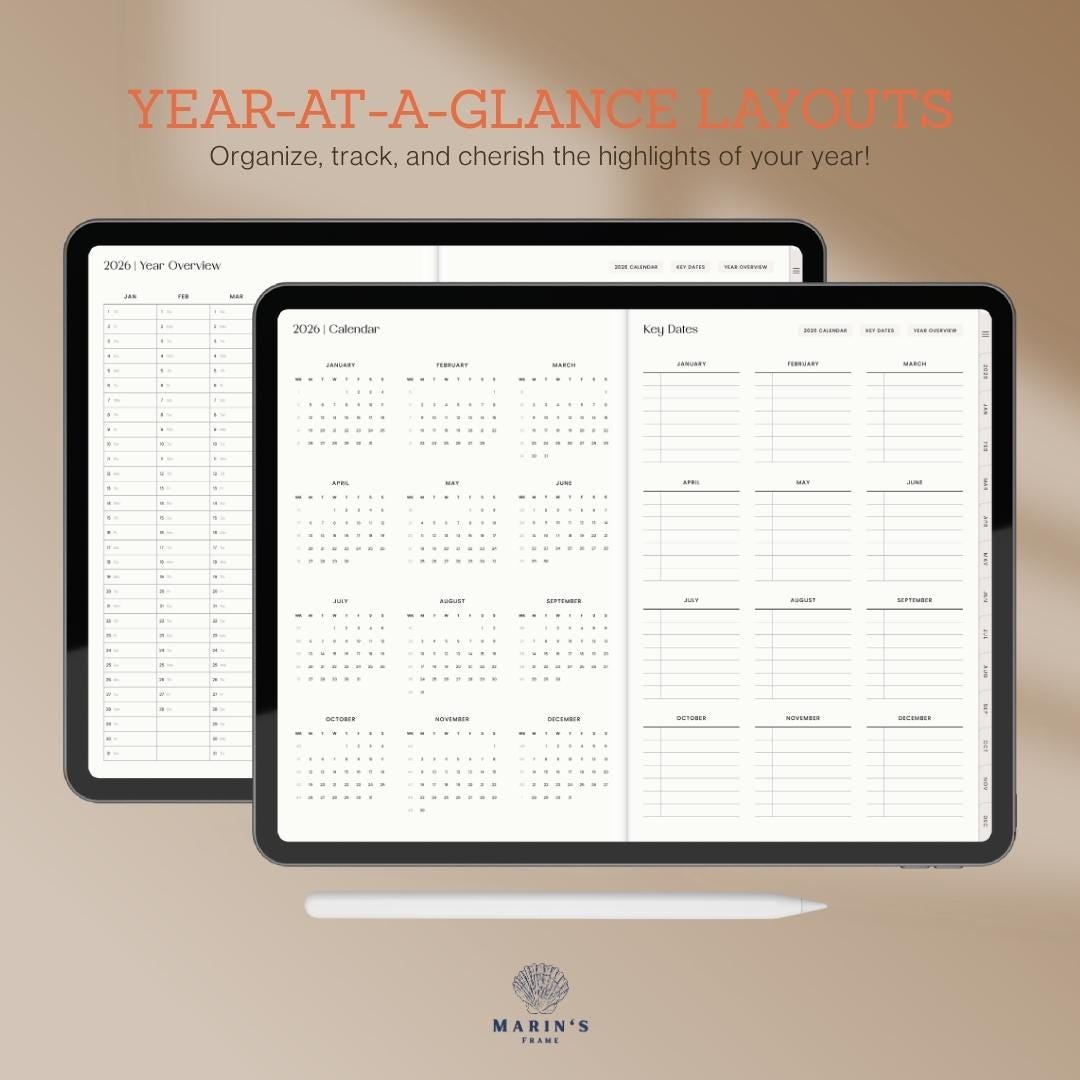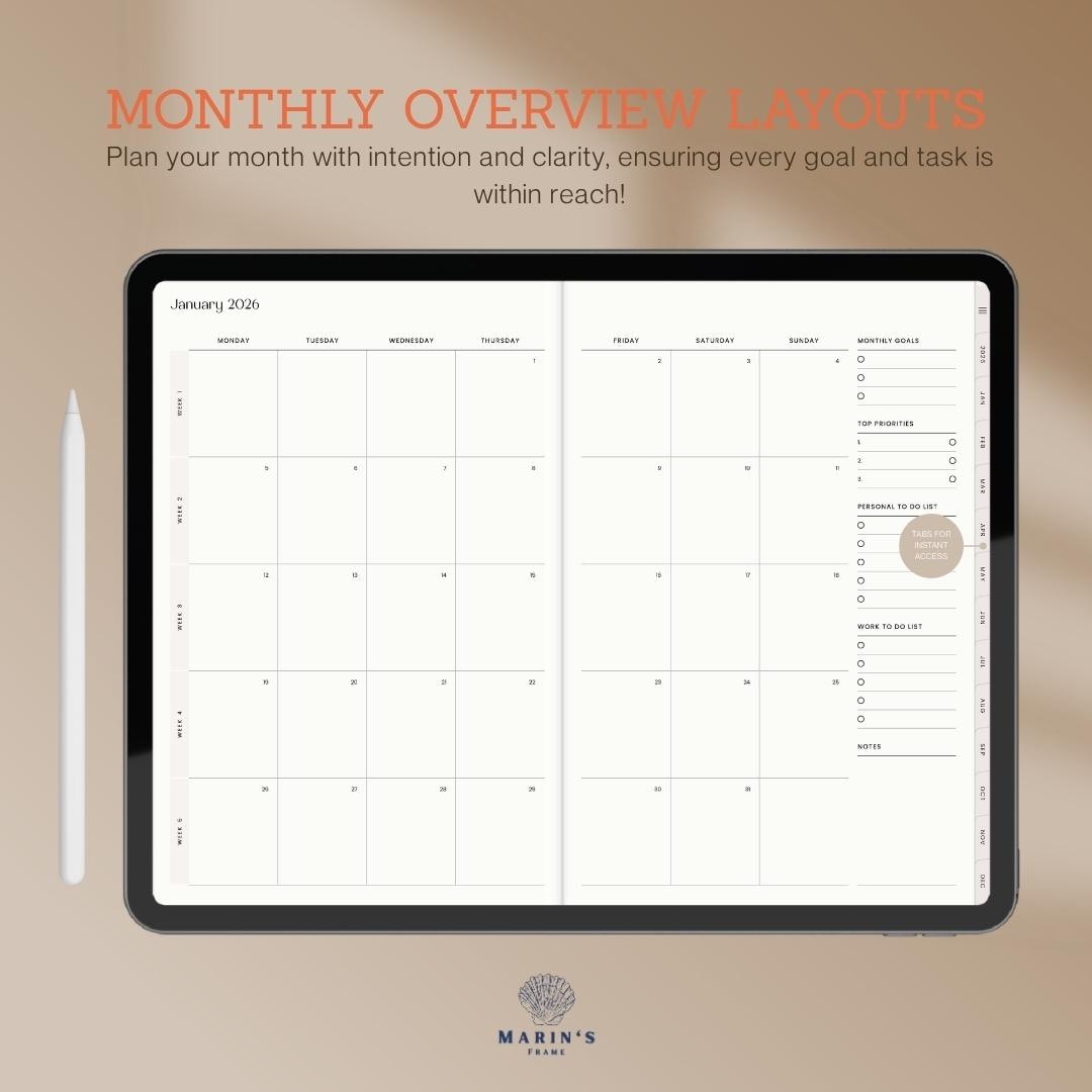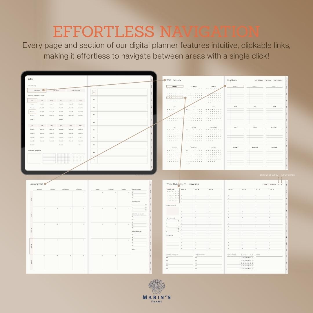 Unlock your productivity and elevate your planning experience with this beautifully designed 2026 digital planner, crafted to resemble the timeless elegance of an open book. Thoughtfully structured with yearly, monthly, and weekly pages, it helps you stay organized and on track! Navigate seamlessly with intuitive hyperlinks, and personalize your planner with 10 custom sections and versatile note templates. These pages are ideal for goal-setting, journaling, and project management. With two stylish cover options to choose from, this planner adapts to your unique lifestyle!