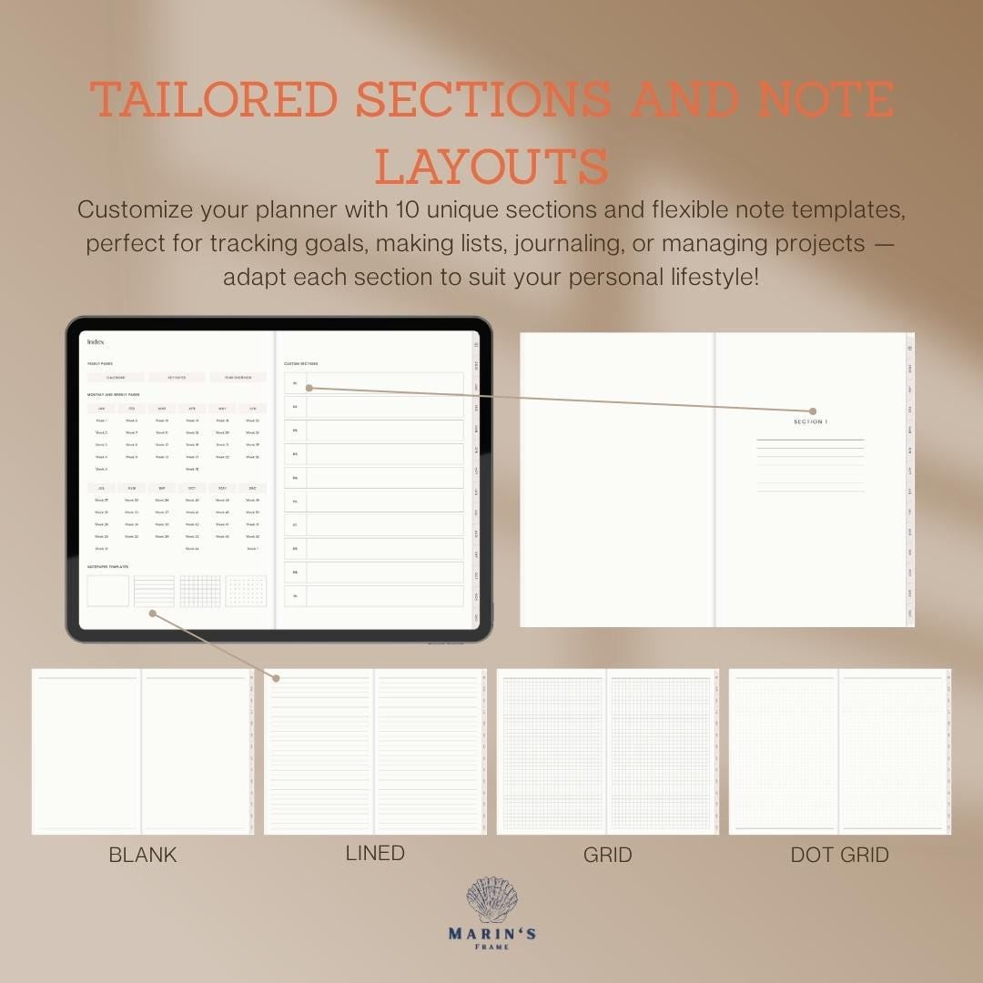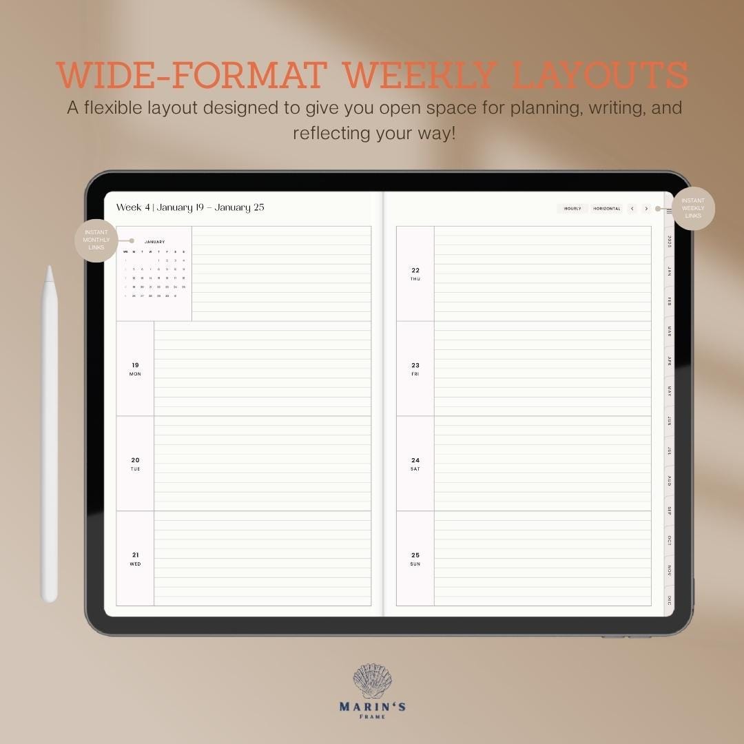 This planner is designed in a landscape format that closely follows the 4:3 aspect ratio used by most iPads, making it widely compatible across popular models. Please note that screen sizes and aspect ratios can vary slightly between iPad models and apps (such as GoodNotes, Notability, or CollaNote), which may affect how the planner is displayed. If you are unsure how it will look on your device, feel free to message us and we will be happy to send you a sample page to preview before purchasing.