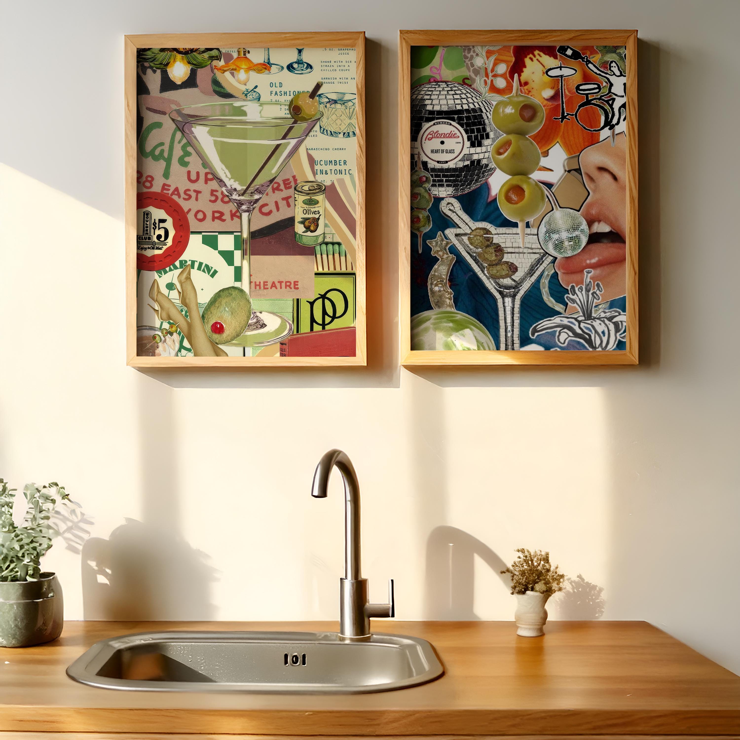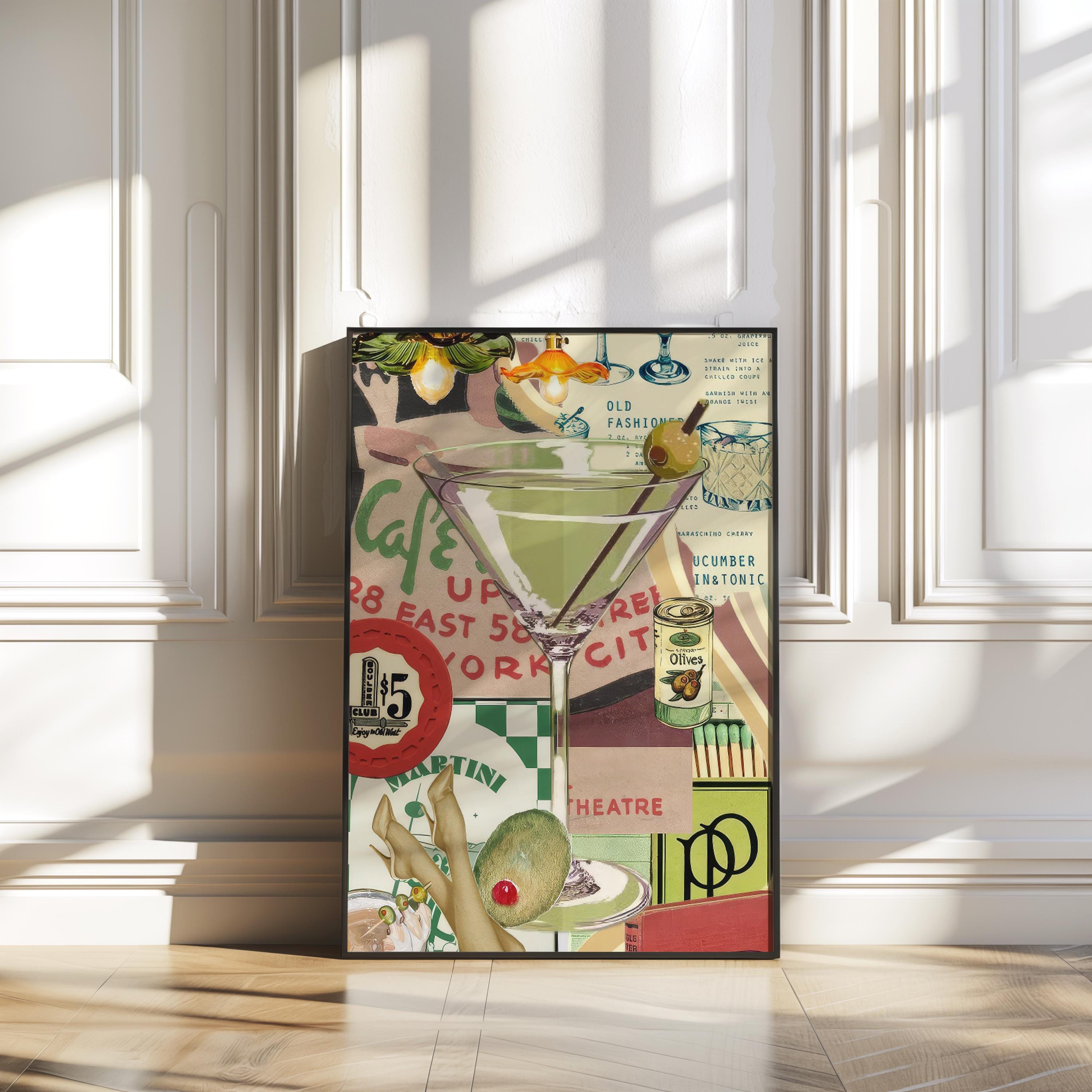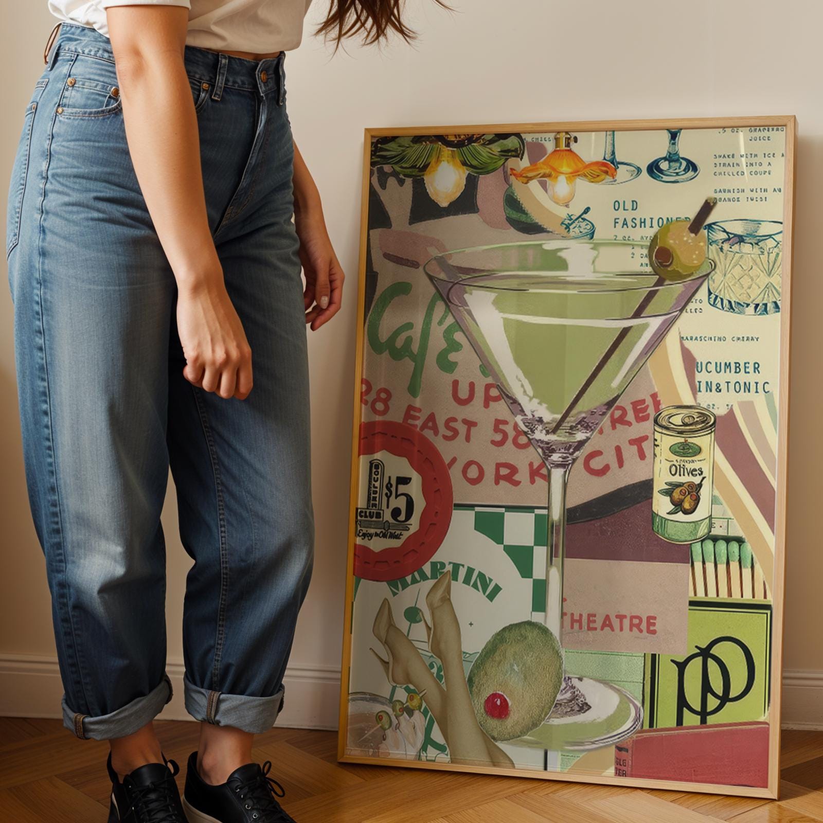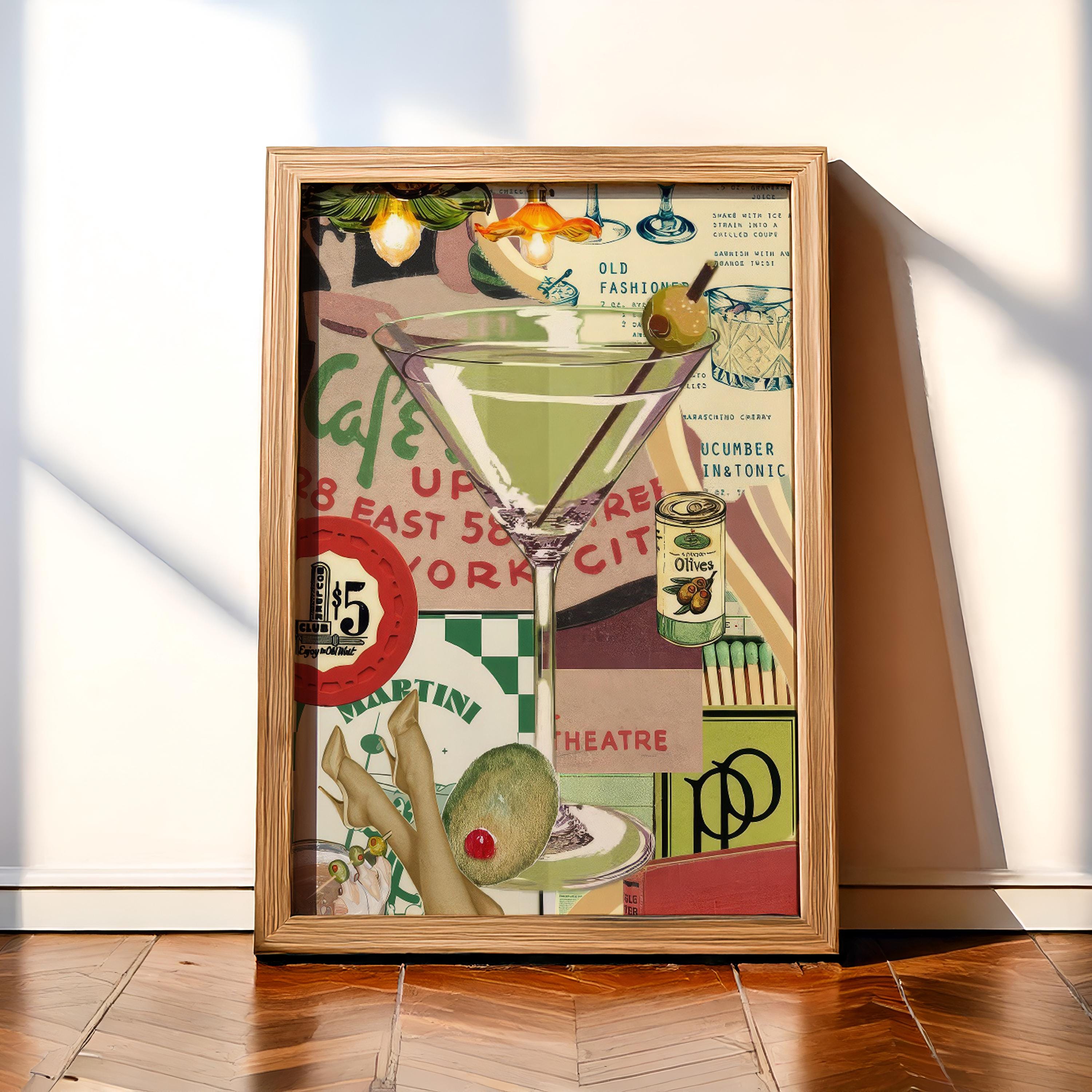 Bring the charm of vintage cocktail culture to your home with this digital printable download! This retro collage wall art features martinis, olives, and classic bar decor — perfect for your kitchen, bar corner, or living room. Step back into the golden age of cocktails with this vibrant vintage martini collage. Designed in a nostalgic 1950s-inspired style, it celebrates happy hour elegance through colorful illustrations of glasses, lights, and classic drink menus.