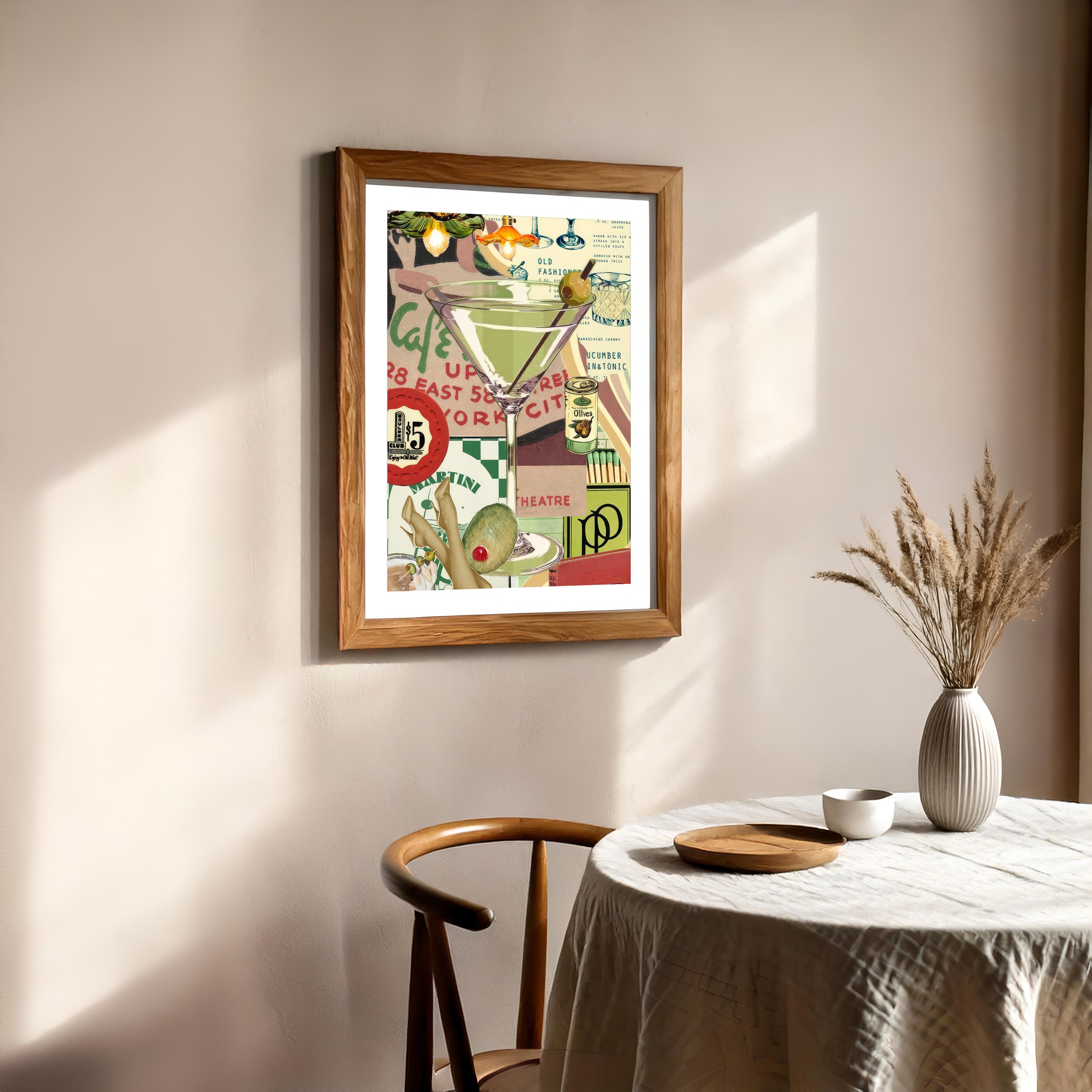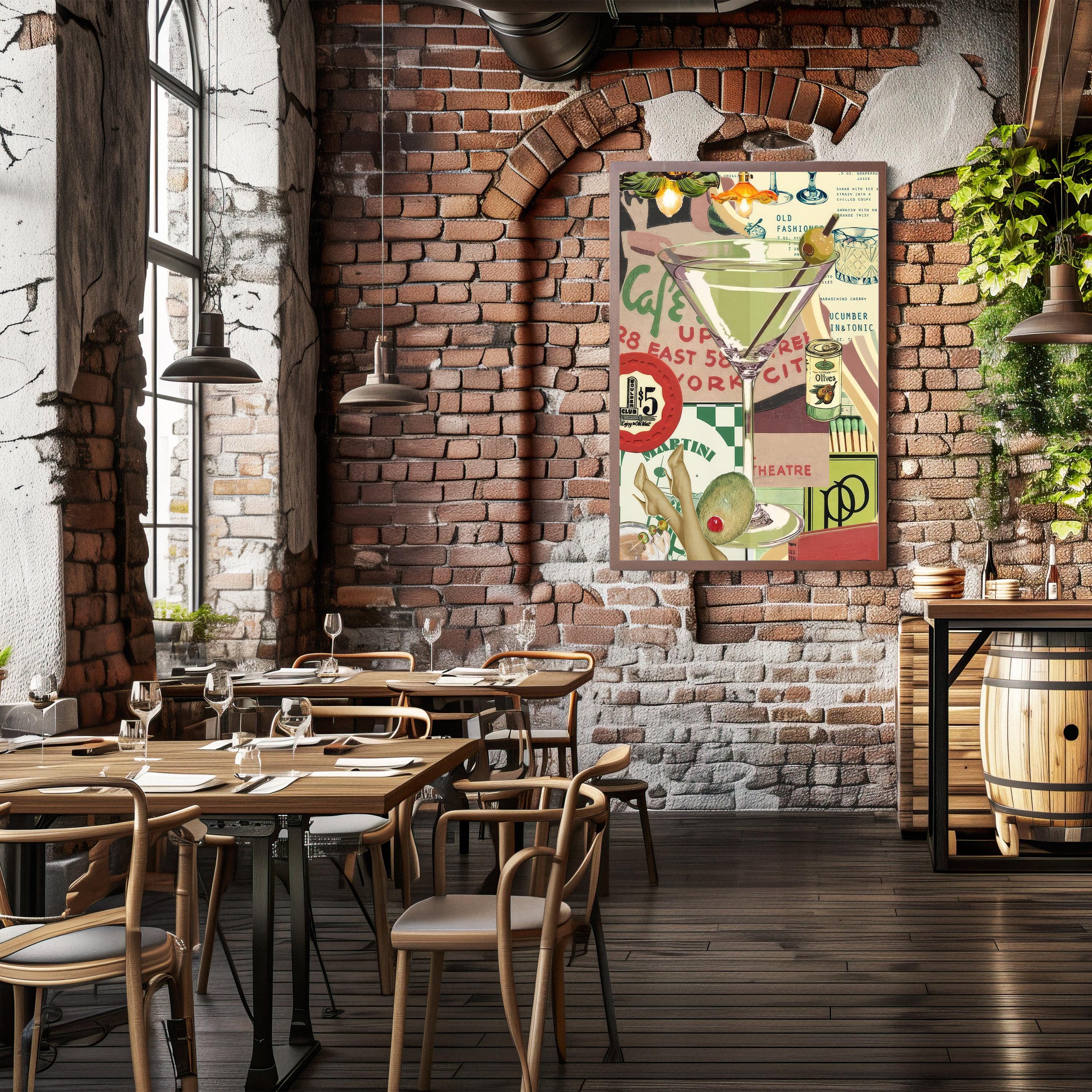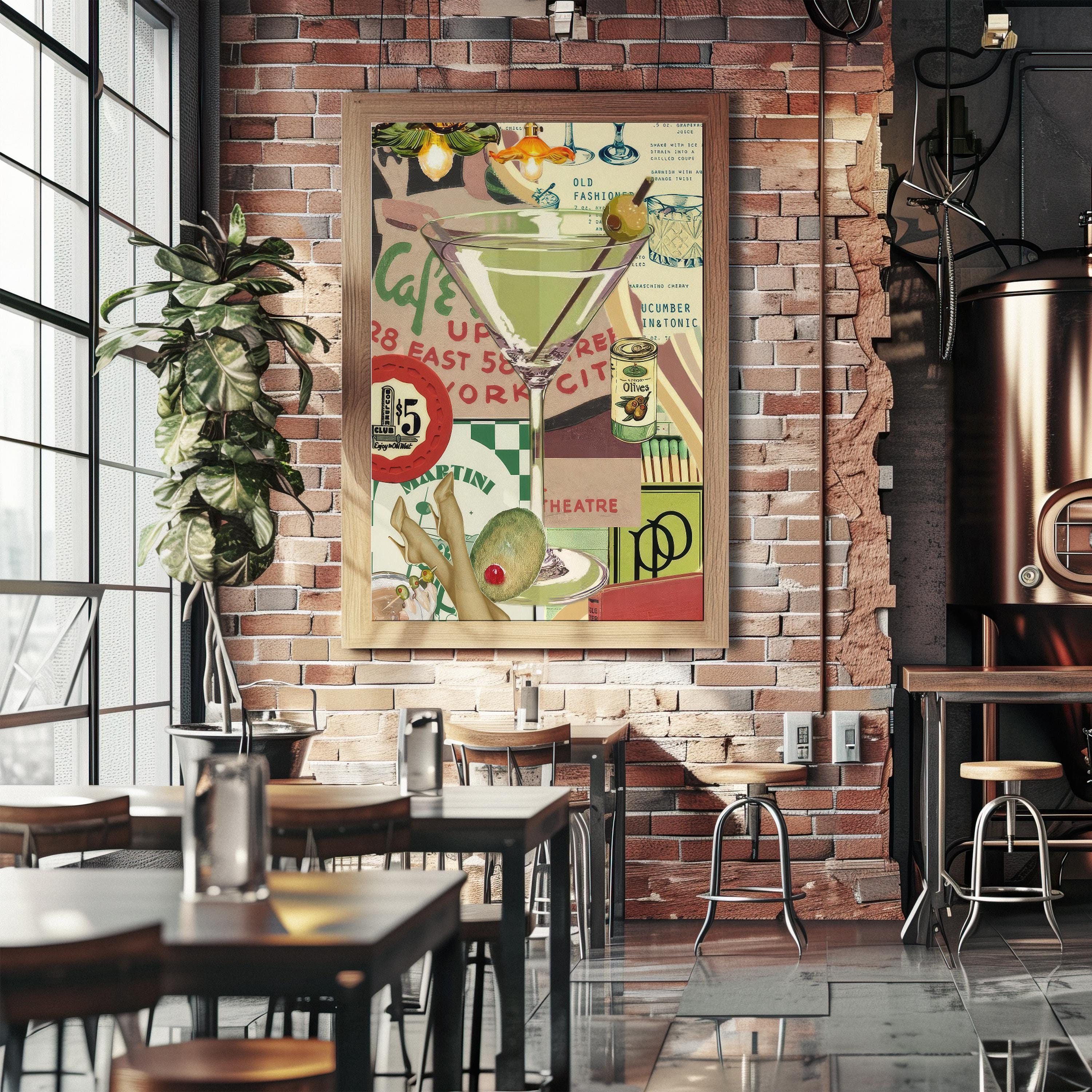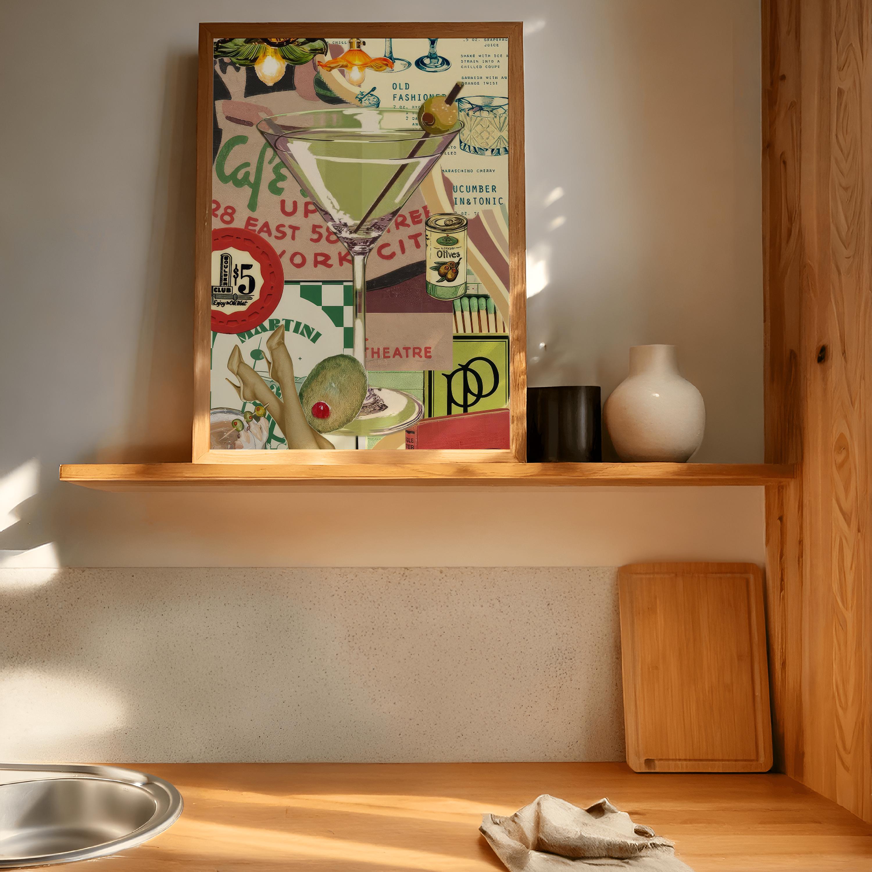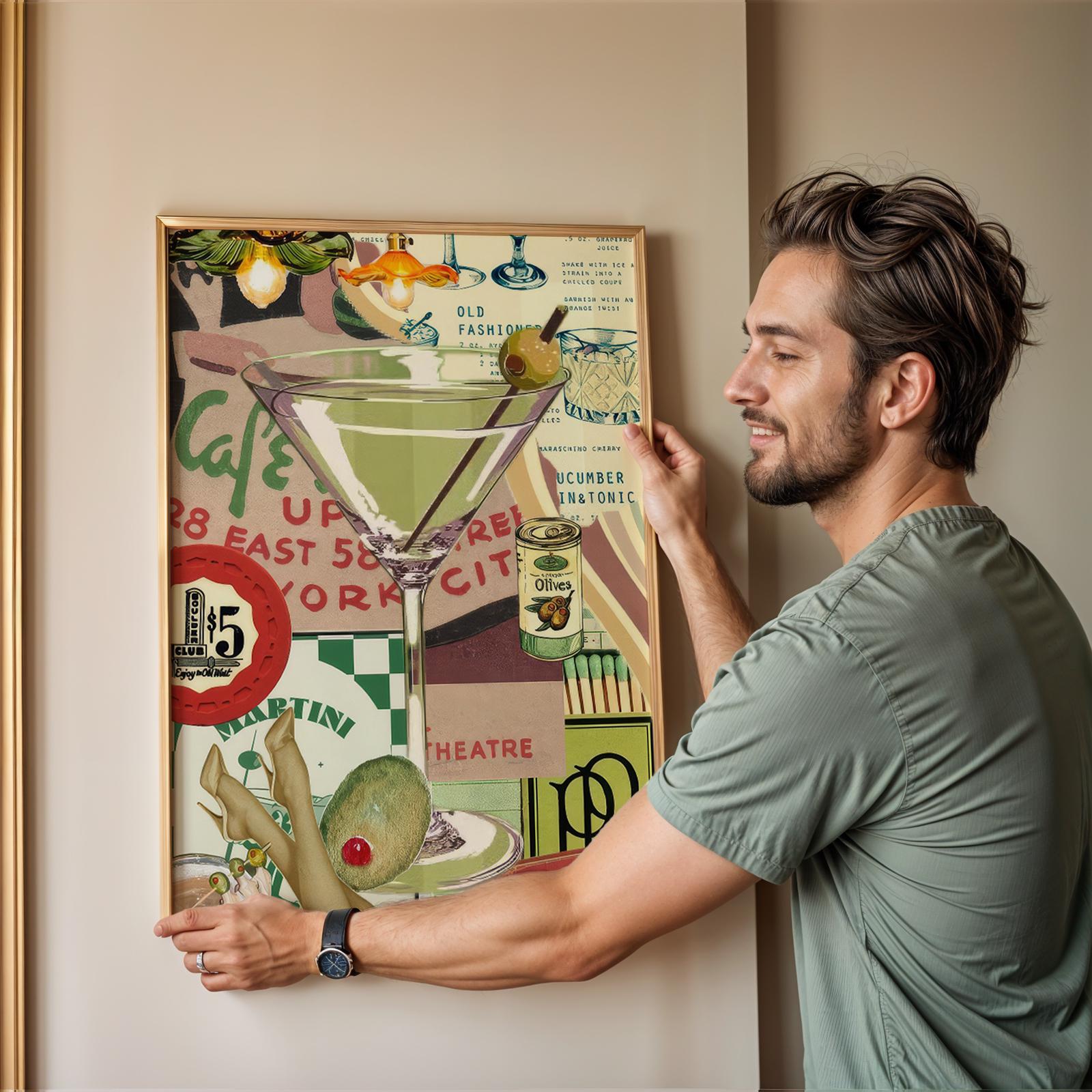 Bring the charm of vintage cocktail culture to your home with this digital printable download! This retro collage wall art features martinis, olives, and classic bar decor — perfect for your kitchen, bar corner, or living room. Step back into the golden age of cocktails with this vibrant vintage martini collage. Designed in a nostalgic 1950s-inspired style, it celebrates happy hour elegance through colorful illustrations of glasses, lights, and classic drink menus.