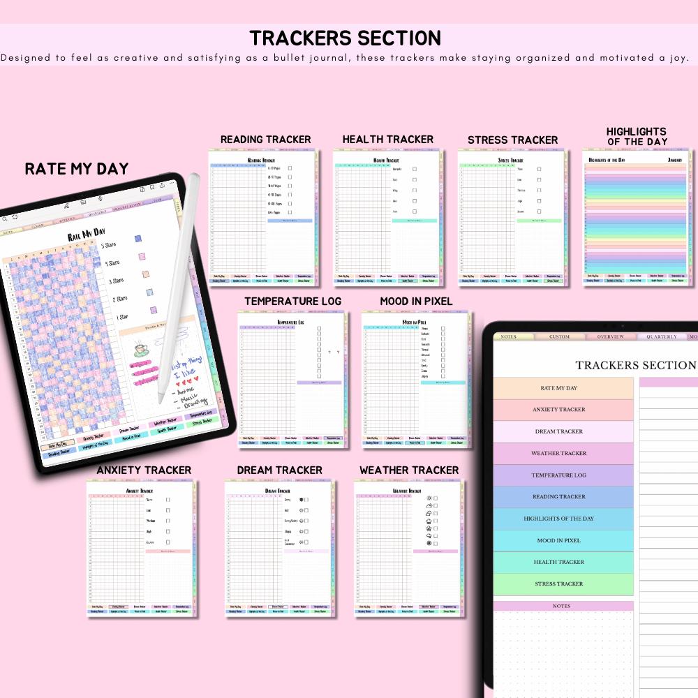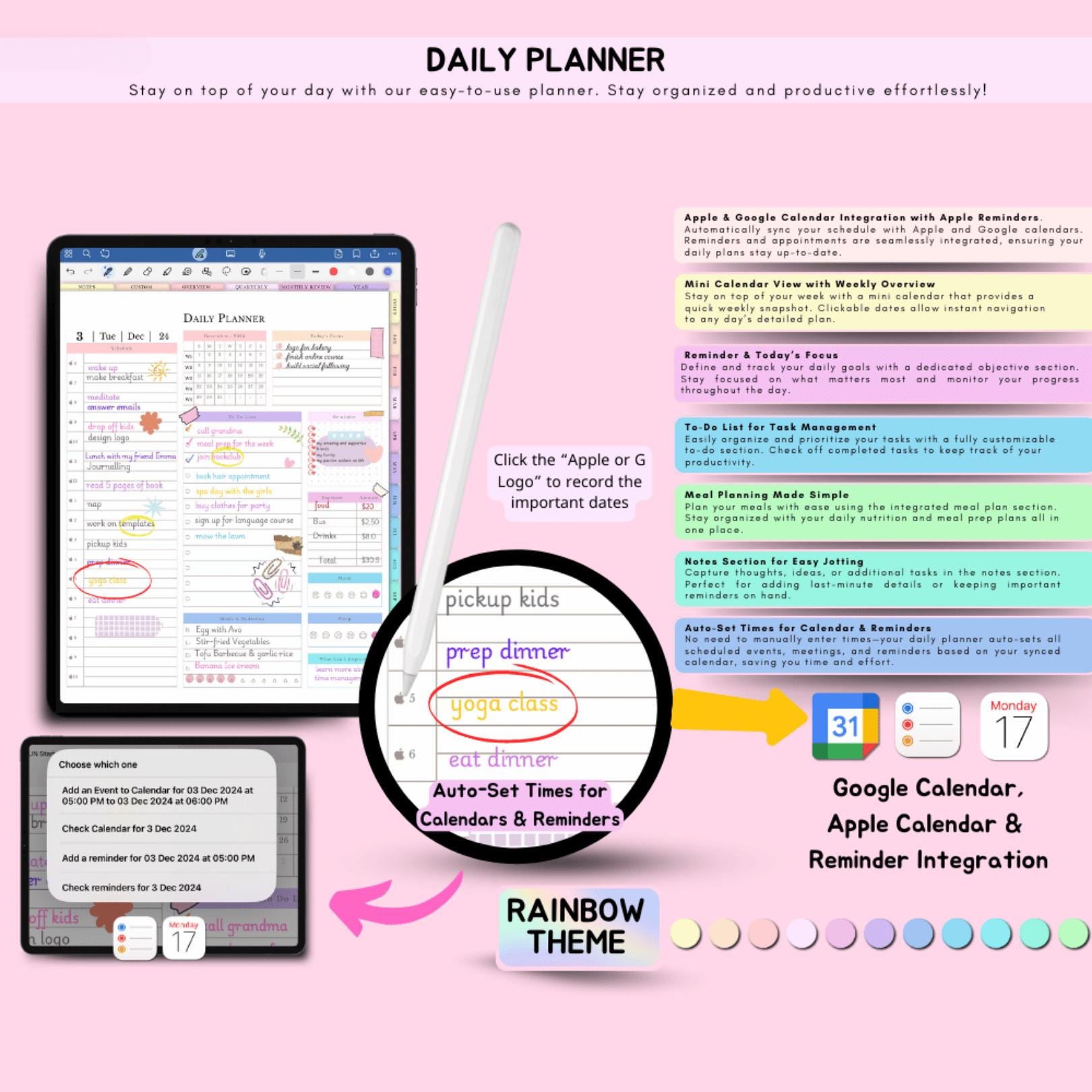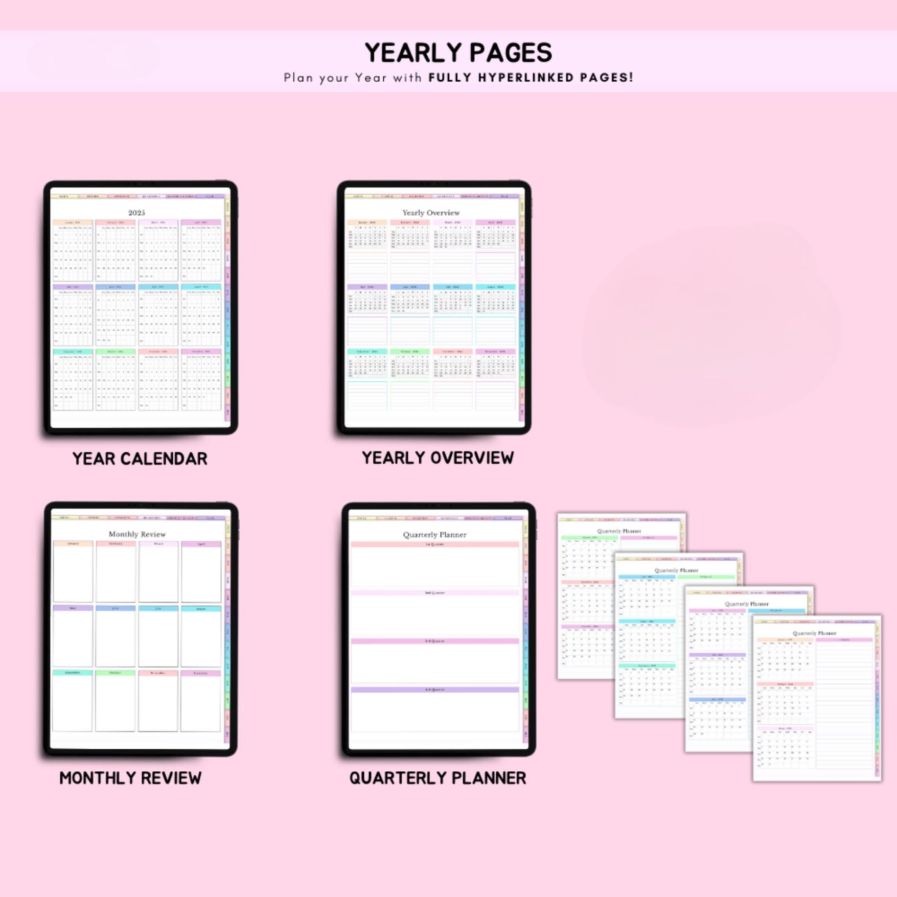 Designed for iPad, Goodnotes, Notability, and other annotation apps, this elegant digital planner blends productivity with beauty through soft rainbow hues and refined organization tools.