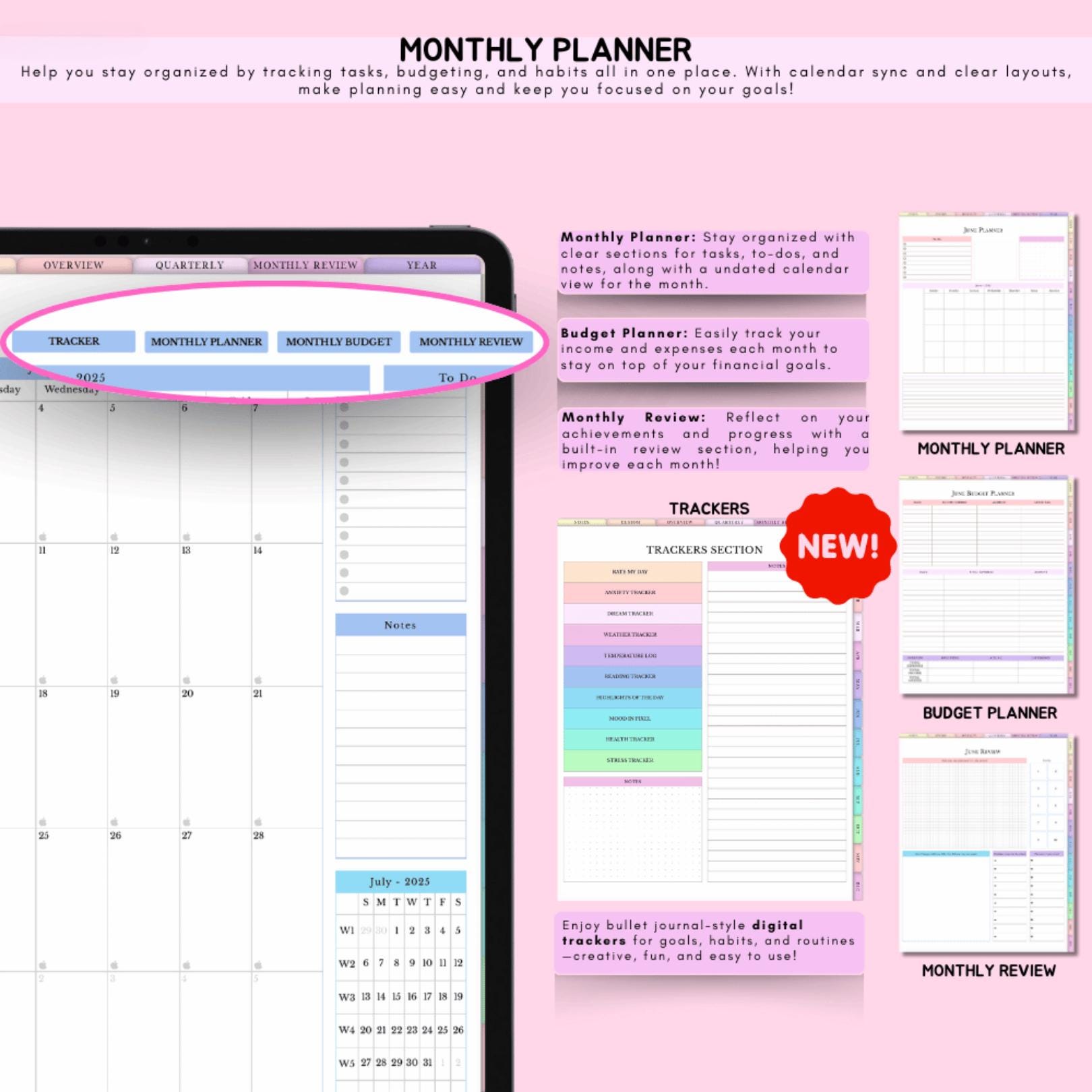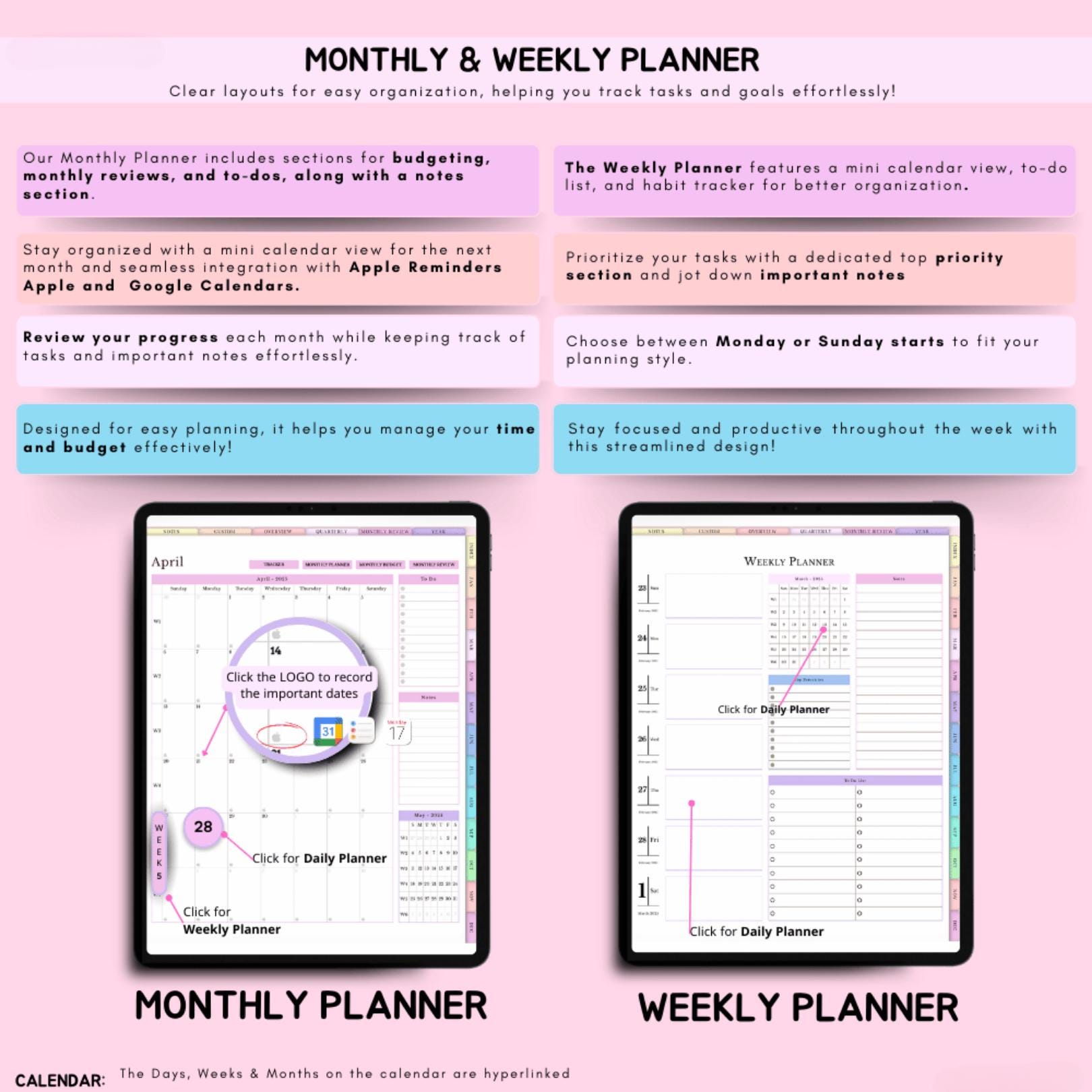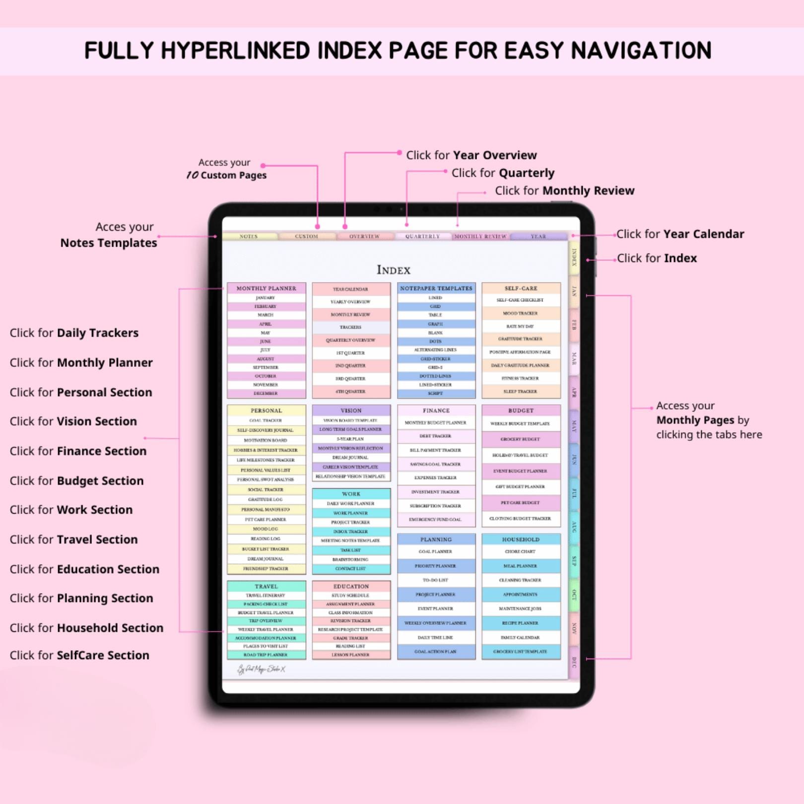 Designed for iPad, Goodnotes, Notability, and other annotation apps, this elegant digital planner blends productivity with beauty through soft rainbow hues and refined organization tools.